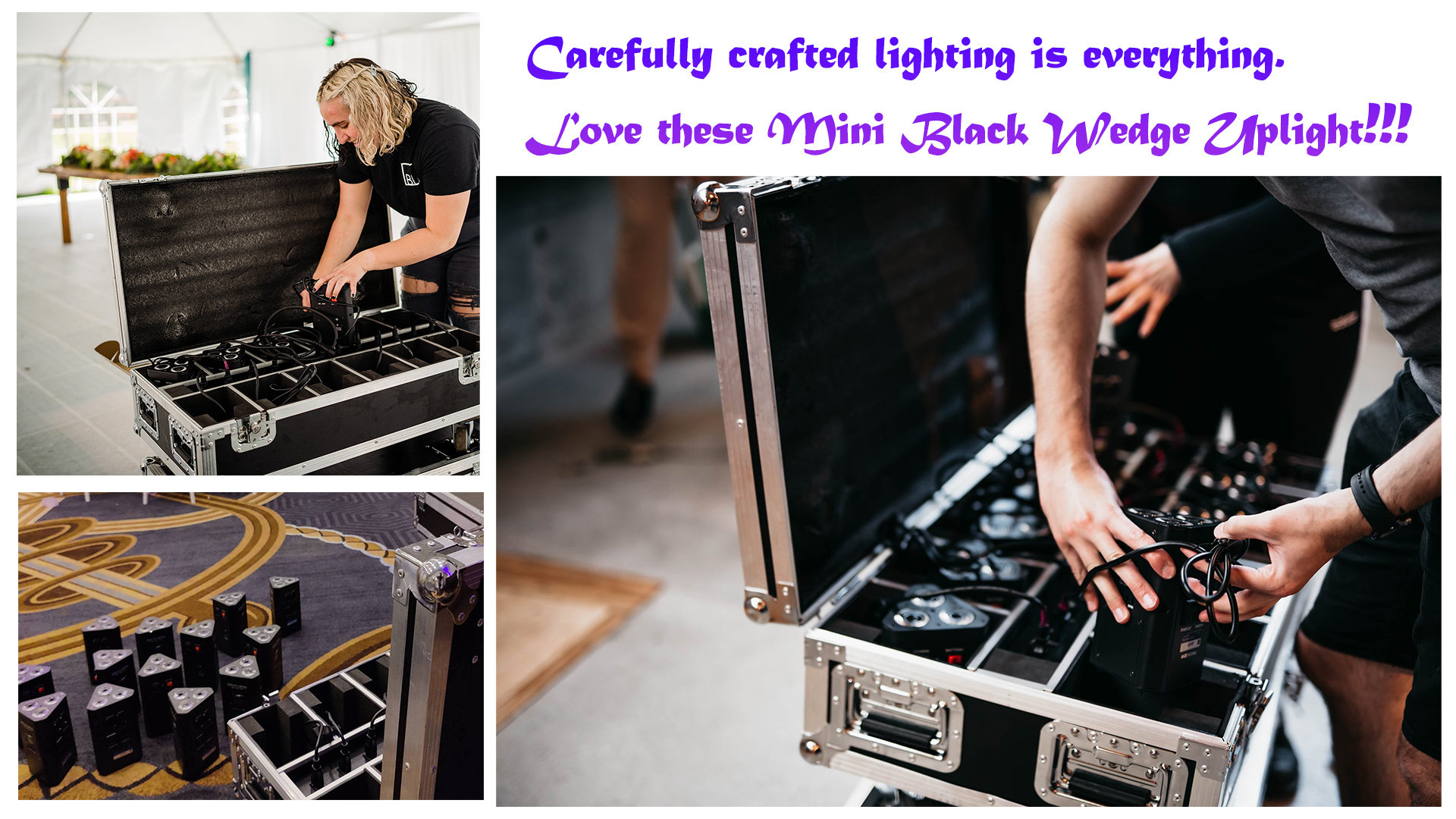 Looking for Modern and convenient lighting / special effects for your event? Our wedge battery uplight is a good choice! Kevin loves the black wedge one! He always puts it to good use on any occasion, special event. A Black version fixture in an event with custom and coloured beams also can fit your theme. Obviously, from the photos, it can be seen that he is a very professional and stylish photographer and event planner