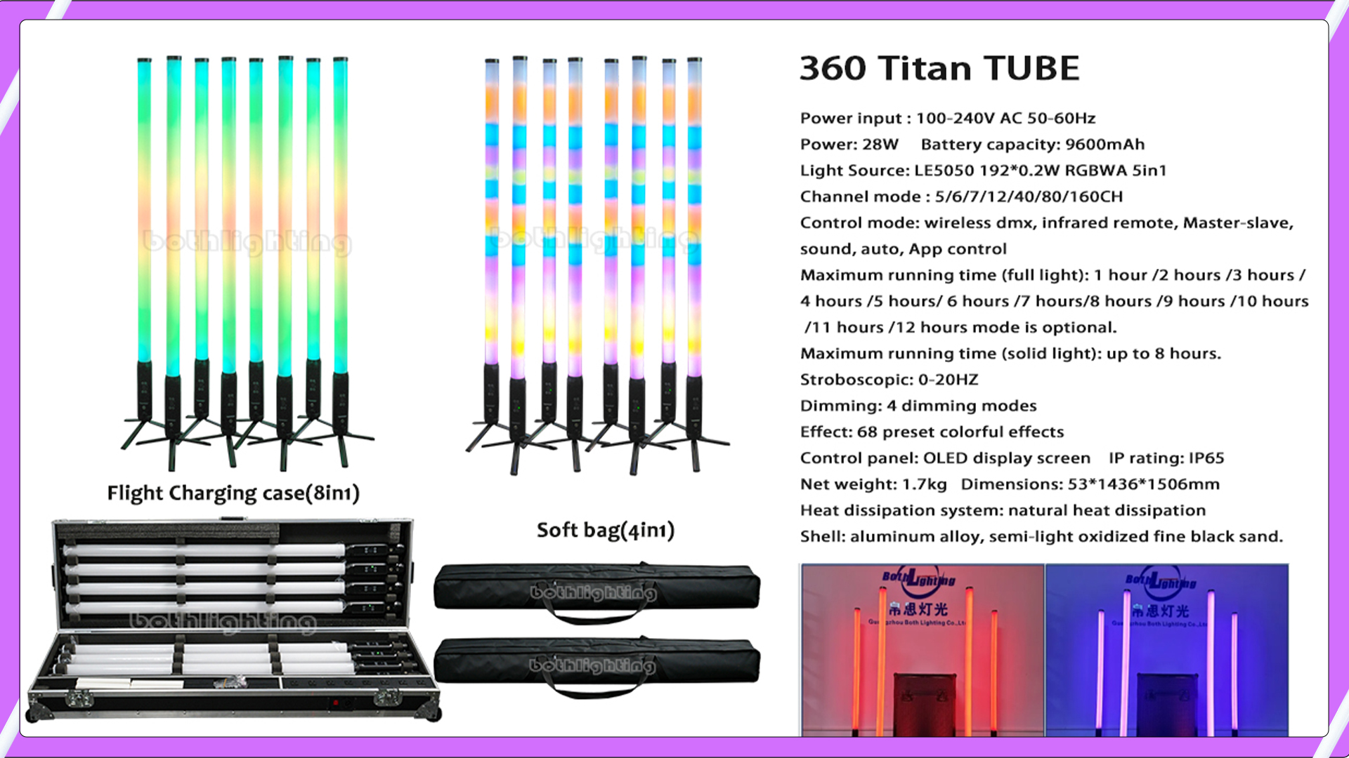 These tubes come in a wide range of colors and can be easily programmed to create different lighting effects and moods. They are also incredibly durable and long-lasting. They built in Smart APP&Remote&DMX Programming. And have hard case & soft bag for packaging.