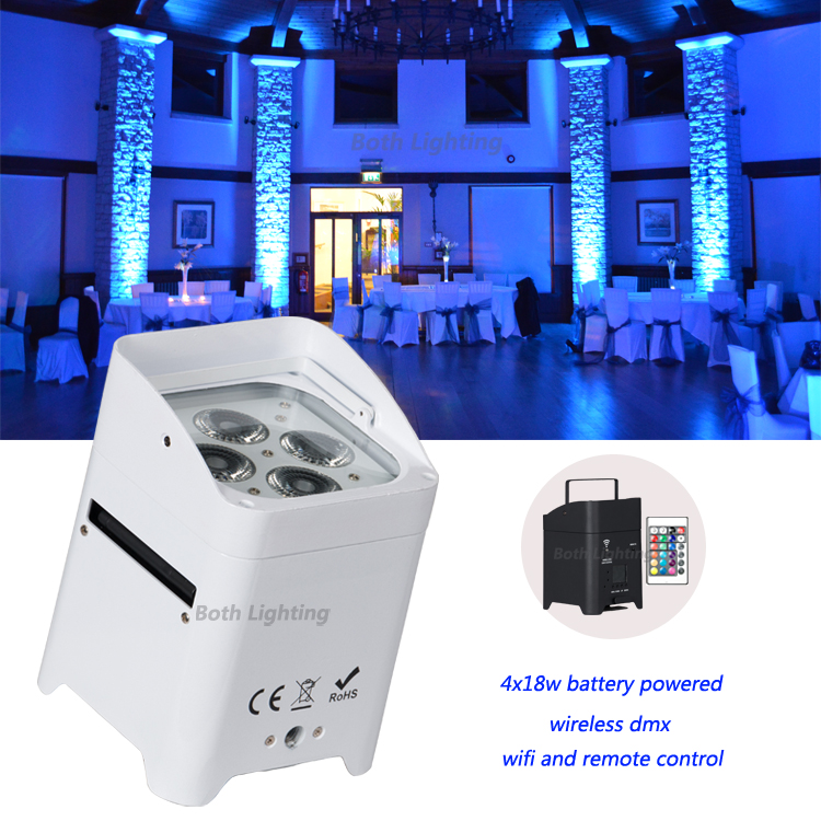Using high-quality materials, perfect craftsmanship, exquisite and beautiful, safe and reliable, give you the perfect quality assurance.,High-brightness beading, high-quality lamp beads, while improving quality, make the color more uniform and richer. The LCD display interface is clearer and the operation is smoother.4x18w RGBWA UV 6in1 wireless dmx LED Uplight with WIFI Remote control,product internal wifi and remote control,no need for wiring, no cumbersome, no need to connect the power cord, the signal is full, eliminating the cumbersome stage show wiring.Support DMX512, master/slave, auto, sound active, among them are automatic models, including color changes, strobes, dimming, gradients/jumps, suitable for KTV rooms or wedding.