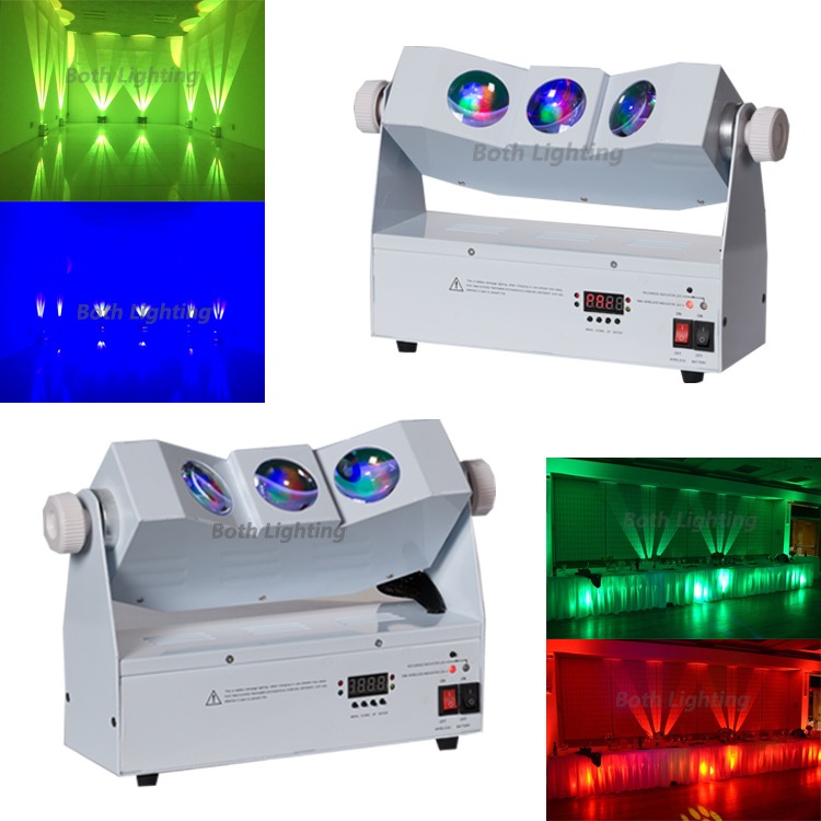 Tri Beam 3x10w rgba 4 in 1 wireless dmx battery led wall washer Battery powered, Single Color 24 hours run time, gradual change Colors:last for 12 hours,All Colors:last for 5 hours,4 -6hours charge time.Tri-beam effect ideal for accenting walls and other surfaces, but also can be used to create unique beam effects.Ideal for wedding up-lighting. add excitement to your existing up lighting. 11in ×3.7 in × 7.6in,Trigger eye-catching effects with built-in automated programs via Master/Slave, DMX mode. Weight: 5KG,Control Channels: 7, 12 or 15 DMX Channels, Light source 3x10w rgba 4 in 1 led,Total power 90w,Long life led ,60000 hours,The head is adjustable ,can change the beam ,high and wide,It looks like a beautiful flowers.3x10w beam led wall washer battery,Super beam, even dyeing, dynamic sound control, colorful and cool world,High brightness led and smooth color mixing,The head is adjustable ,can change the beam ,high and wide,It looks like a beautiful flowers,Suitable for discotheques, clubs, bars, parties, mobile DJs, concerts and so on.