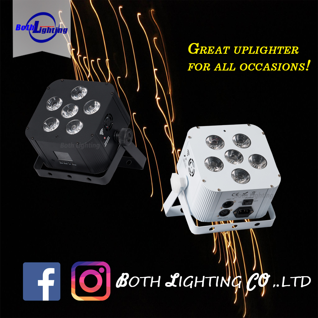 High brightness 6x18W RGBWA +UV LED par light, Built in 2.4G receiver / transmitter for wireless DMX operation,Battery Powered & 2.4G DMX wireless receiver/transmitter control/remote control.Rechargeable Battery with up to 12 hours of battery life.it support DMX512,Master/Slave,Auto run & Sound active four control mode. It can also control by wifi and remote, which is easy to control whatever you are a profession or new. Besides, it easy to carry, can be used anytime, anywhere. Heavy-duty aluminum alloy and glass material, dustproof and durable.