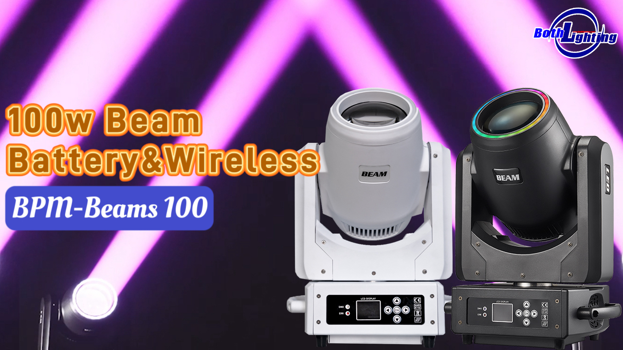 Equipped with a built-in rechargeable battery and wireless DMX control, the BPM-Beams 100 offers flexible, cable-free operation. Multiple control modes—including DMX512, auto, sound-activated, and master/slave—allow for versatile lighting setups. The precise movement and high-output beam provide dramatic effects, from sharp beams to sweeping patterns.
